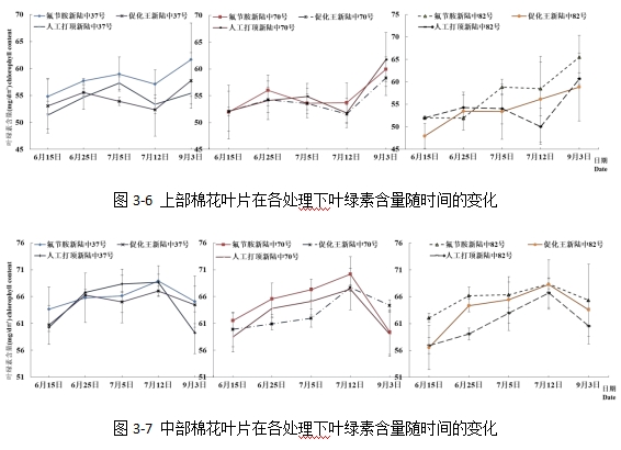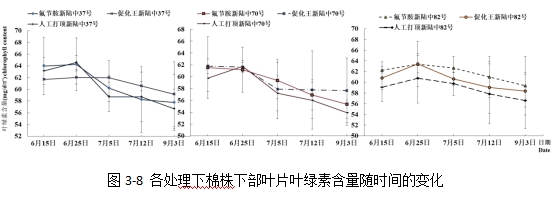 新陸中37號與新陸中70號,噴施促化王打頂?shù)拿藁ㄏ虏咳~片葉綠素含量高于其他兩種打頂方式下的棉花;而新陸中82號,則是使用氟節(jié)胺打頂?shù)拿藁ㄏ虏咳~片葉綠素含量高于其他兩種打頂方式處理下的棉花。